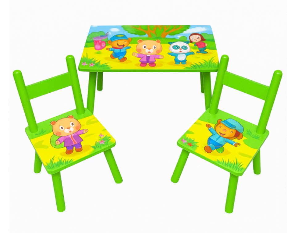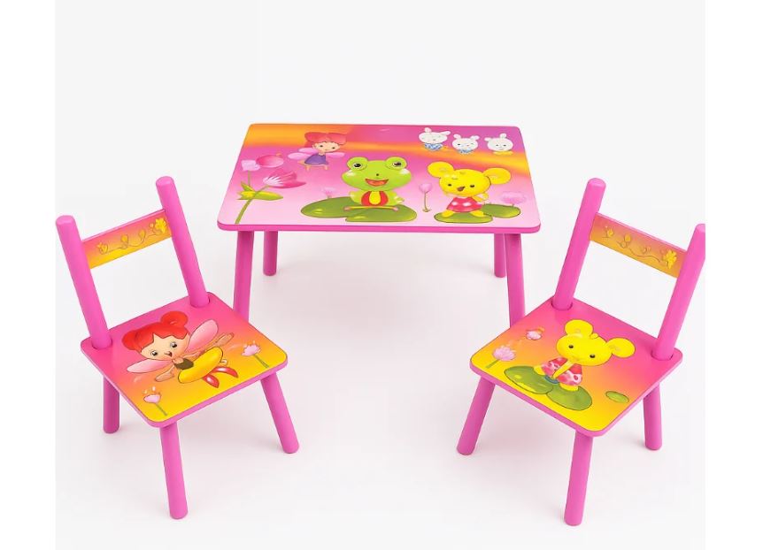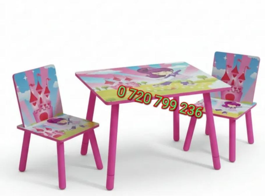 Masuta cu 2 scaunele Cadrul este din aliaj metalic, rezistent dar nu foarte greu. Colturile sunt rotunjite si finisate pentru a-i proteja pe cei mici. Picioarele masutei si ale scaunului au protectie din plastic pentru a evita zgarierea podelei. Dimensiuni: - masuta: (lxLxH):Â cca 60 x 60 x 45 cm - scaun: dimensiuni (lxLxH): cca 30 x 28 x 42 cm Materiale: - blat MDF acoperit cu melamina imprimata cu decor copii - structura metalica din teava patrata de 3 cm, vopsita - canturi protejate cu platbanda aluminiu, colturi rotunjite - protectii plastic la capetele metalice Varsta recomandata: + 1 an Greutate maxima suportata: 30 Kg Produs nou!Poze reale! 199lei -