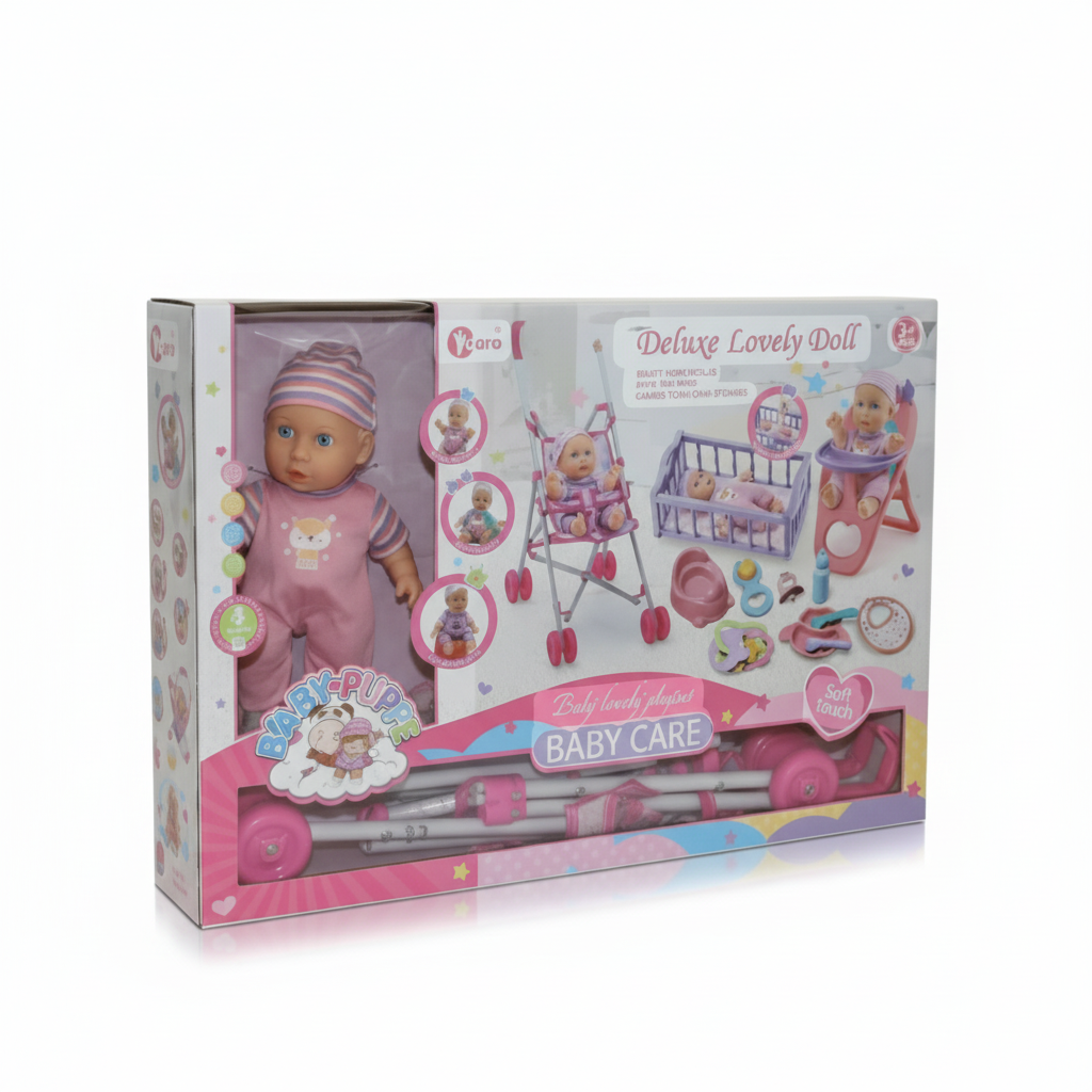 Set de Joacă Complet Deluxe Lovely Doll – Păpușă Bebeluș cu Cărucior, Pătuț și Accesorii de Îngrijire, Roz